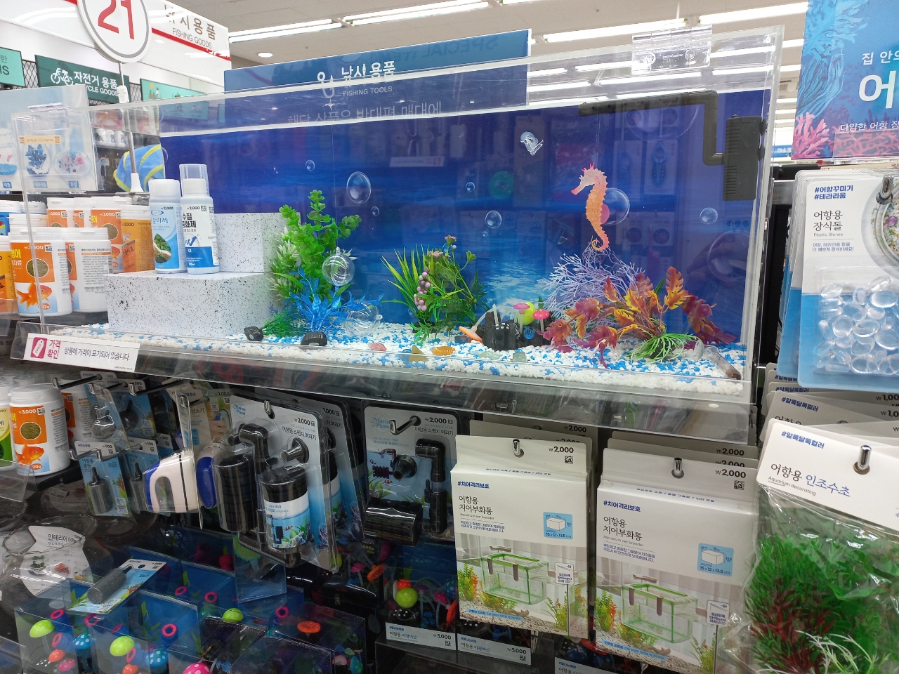 그래도 다양한 디자인의 플라스틱 해초는 한번쯤 사볼까 싶기도 하지만 뾰족한 디자인이 혹시라도 물고기들에게 상처가 되진 않을까 걱정도 됩니다. 다이소에는 어항용 물펌프도 2,000원이라는 저렴한 가격에 구매할 수 있어 어항청소도 가능하구요, 어항용 바닥재나 바닥재 모래삽도 있습니다. 정말 다양합니다.