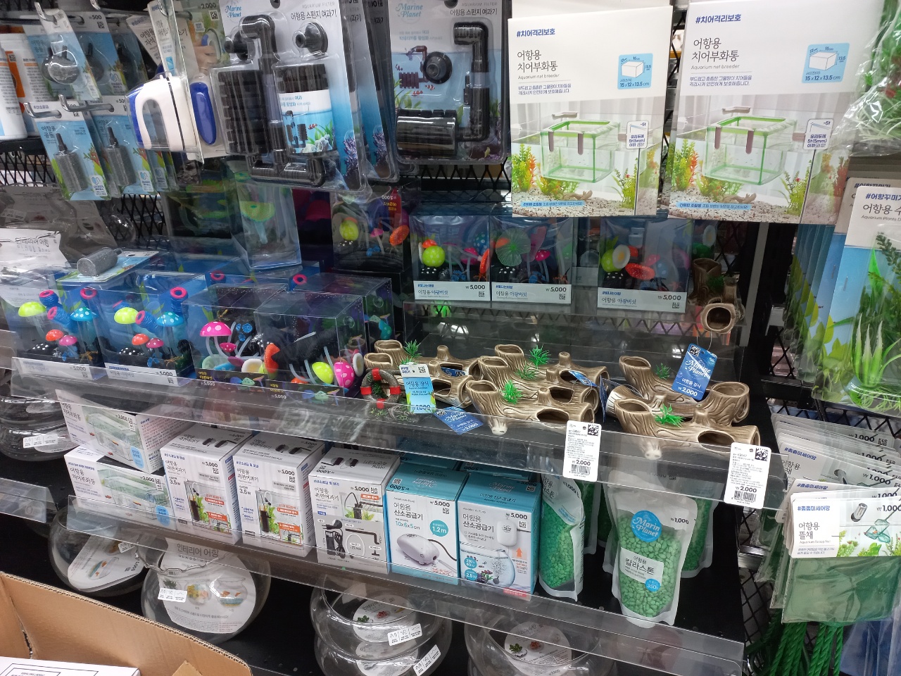 물생활을 처음 시작하게 된다면 다이소는 저렴한 가격으로 기본적인 물생활 용품들을 구비하기에 괜찮은 선택이라고 생각합니다. 다양한 사이즈의 유리어항과 칼라스톤 및 귀엽게 꾸밀 수 있는 어항 장식품도 있으니까요. 사실 칼라스톤이나 플라스틱으로 만들어진 어항장식품은 아무래도 물에 넣으면 좋지 않을 듯하여 구매해본 적은 없습니다.