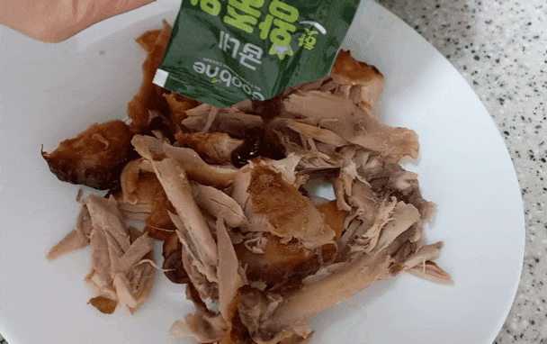 얇게 닭껍질이 덮여있어 껍질을 벗기고 살을 발라본다.